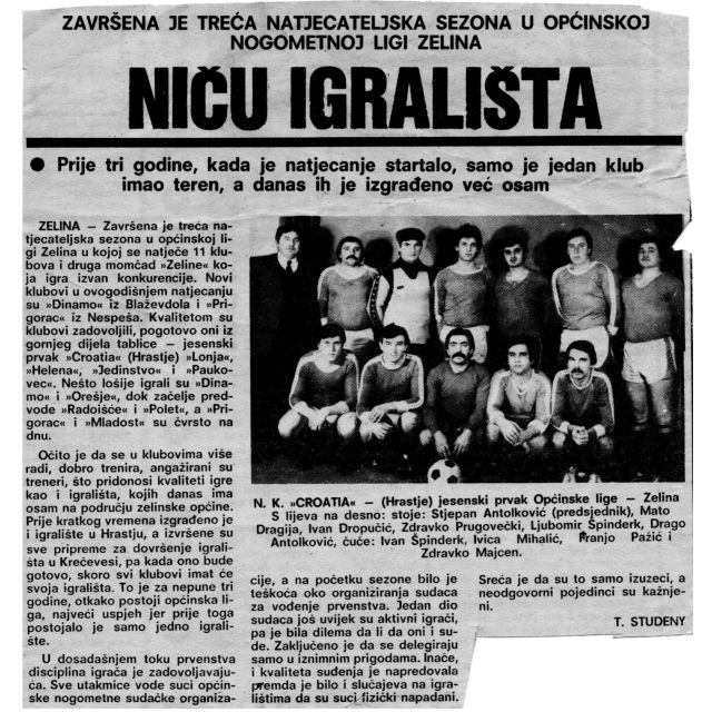S obzirom da mentalitet naših ljudi i težnji nečemu boljem i većem, tako je i ondašnja uprava razmišljala o izgradnji svlačionica i ostalih pratećih prostorija. Opet uz veliku pomoć i razumijevanje šire zajednice krenulo se u nabavku materijala i krenuli su građevinski radovi od temelja do zidova i deke. Bilo je jako teško uz veliko snalaženje oko materijala i izvođača radova, ali nekako se sve privelo kraju. Tu su se naročito zalagali Antolković Stjepan, Špinderk Ivan, Pažić Franjo, Novaković i ostali. Te godine uz sve probleme vezane za radove klub se aktivno takmičio i u općinskoj ligi Zeline. Bilo je aktivno desetak klubova između kojih se razvilo veliko rivalstvo i borba za bodove.